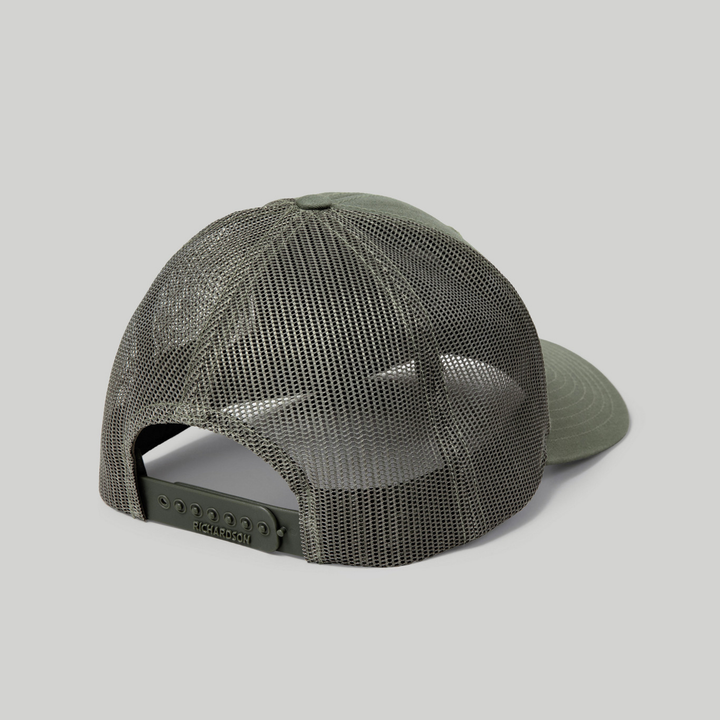 - Loden green cotton/poly front with breathable mesh back
